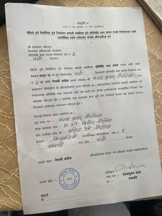 जनमतका श्याम गुप्ताको पर्सा २ बाट उम्मेदवारी दर्ता