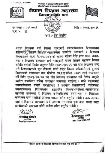 पर्साको बहुदरमाईका विद्यालयमा पठनपाठन सूचारु, तलब भत्ता नपाए पूनः कडा आन्दोलन गर्ने चेतावनी