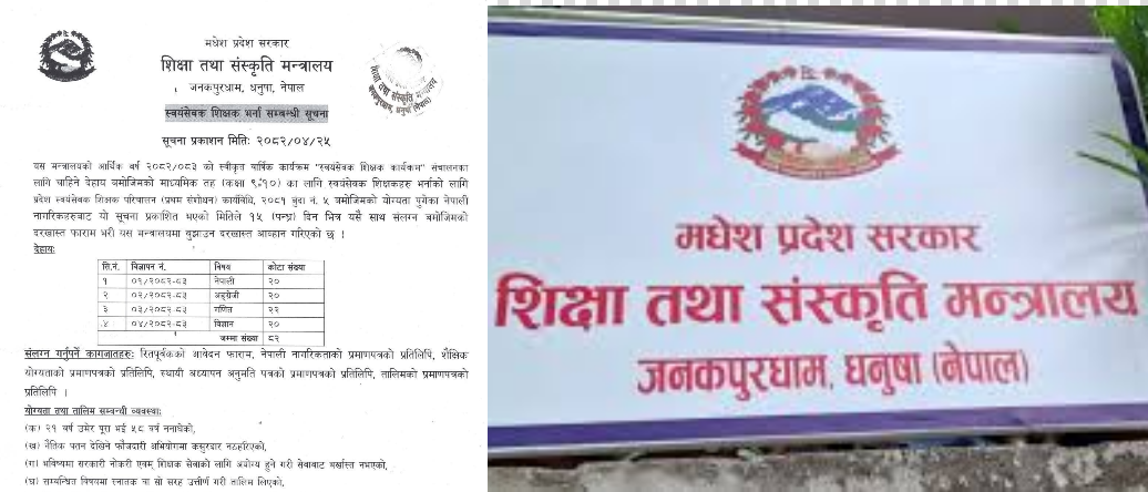 मधेश सरकारद्वारा ८२ स्वयंसेवक शिक्षकका लागि दरखास्त आह्वान