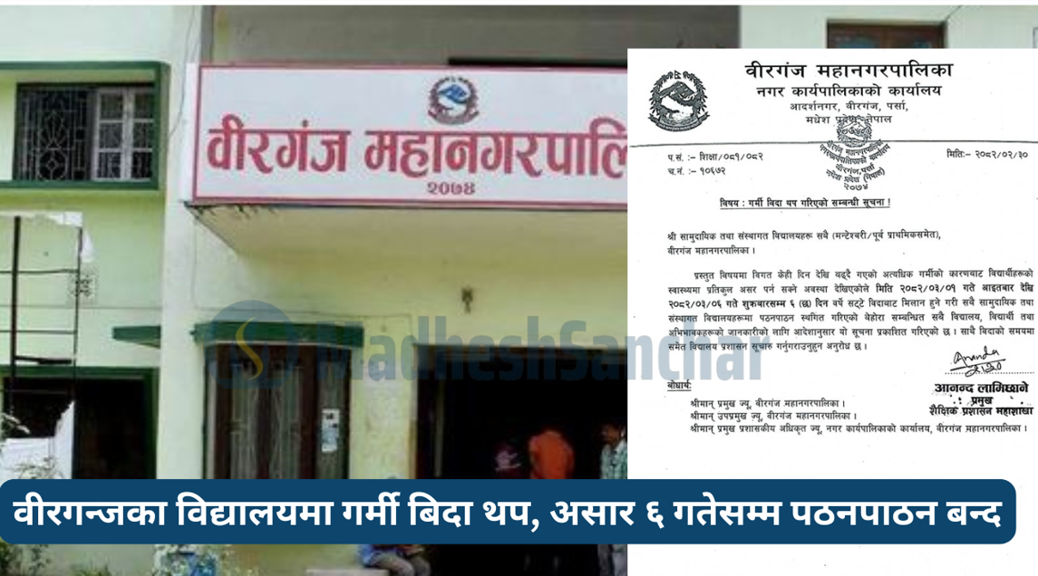 वीरगन्जका विद्यालयमा गर्मी बिदा थप, असार ६ गतेसम्म पठनपाठन बन्द