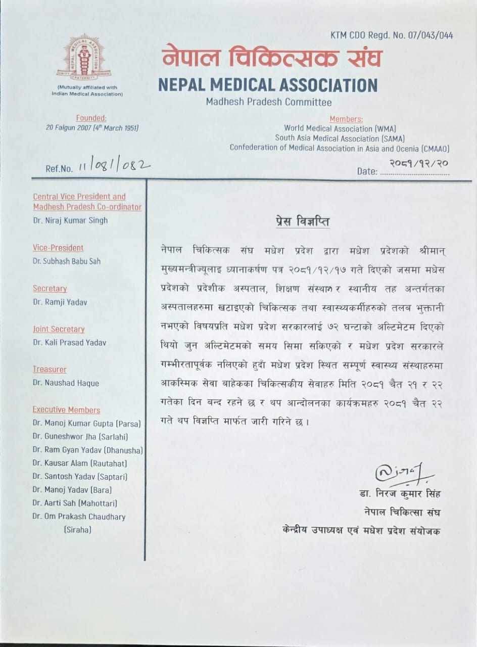 चैत २१ र २२ गते मधेसका चिकित्सकले सेवा नदिने, के हो कारण ?