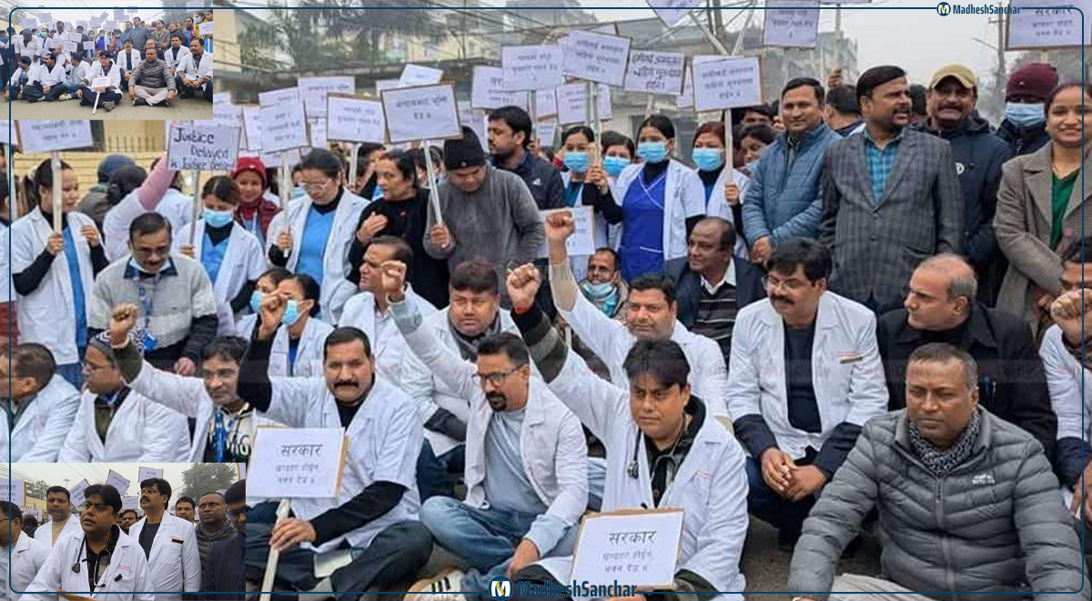 ‘सेतो एप्रोन’ लगाएरै सडकमा उत्रिए नारायणी अस्पतालका चिकित्सक, माग पूरा नभए कडा आन्दोलनको चेतावनी