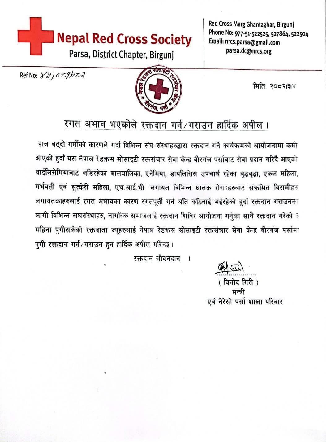 रक्तसन्चार केन्द्र वीरगन्जको अपिल – हामीसँग रगत अभाव छ, कार्यक्रम आयोजना गराउनुहोस्