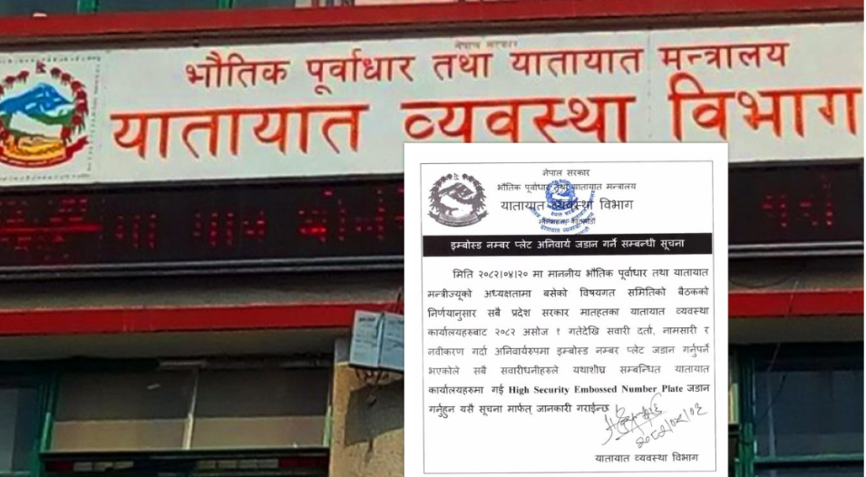 असोज १ देखि इम्बोस्ड नम्बर प्लेट अनिवार्य