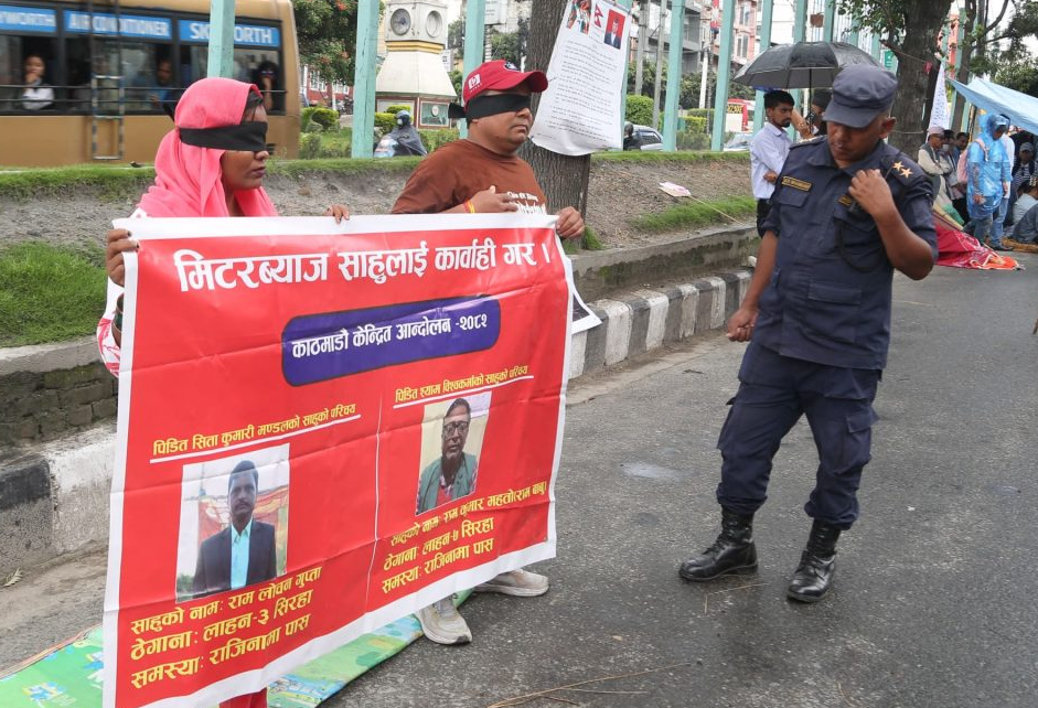 सरकारले पीडा नदेखेको भन्दै आँखामा कालोपट्टी बाँधेर मिटरब्याज पीडितको प्रदर्शन