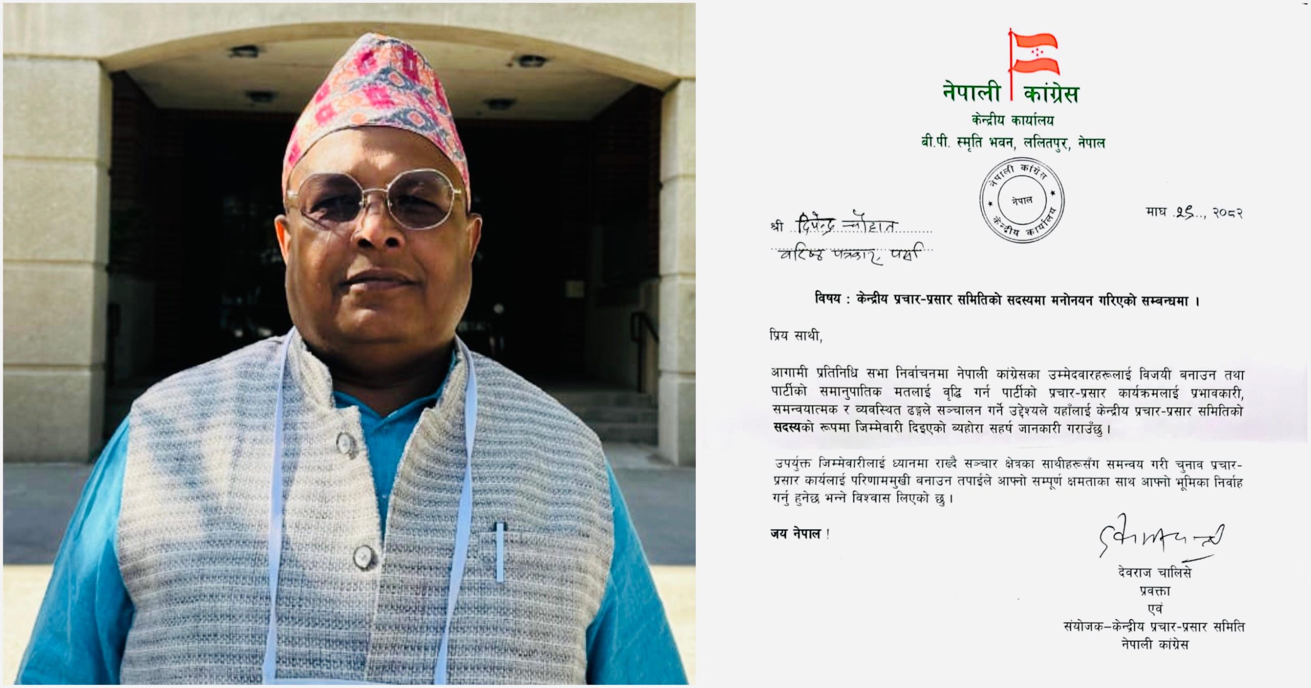 वीरगन्जका वरिष्ठ पत्रकार दीपेन्द्र चौहान कांग्रेस केन्द्रीय प्रचारप्रसार समितिमा मनोनित