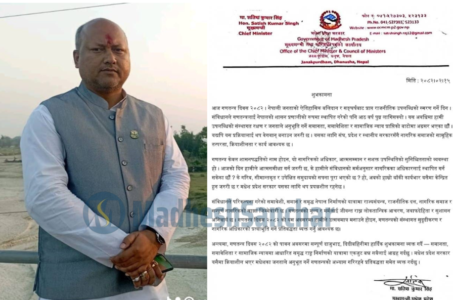 मुख्यमन्त्री सिंहद्वारा गणतन्त्र दिवसको शुभकामना, जनताको अधिकार र आत्मसम्मानका लागि निरन्तर प्रतिबद्ध