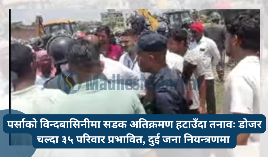 पर्साको विन्दबासिनीमा सडक अतिक्रमण हटाउँदा तनावः डोजर चल्दा ३५ परिवार प्रभावित, दुई जना नियन्त्रणमा