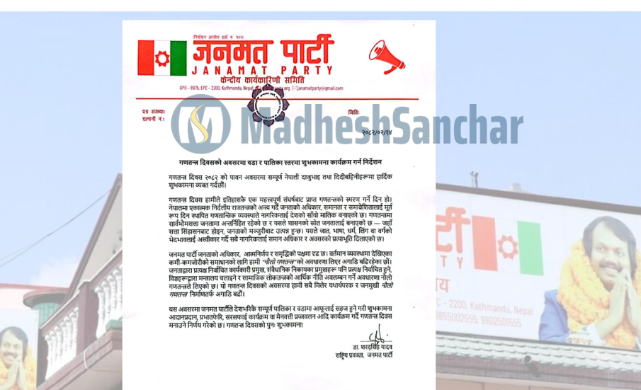 गणतन्त्र दिवस भव्यताका साथ मनाउन जनमत पार्टीको आह्वान : वडा र पालिकास्तरमा विशेष कार्यक्रम गरिने
