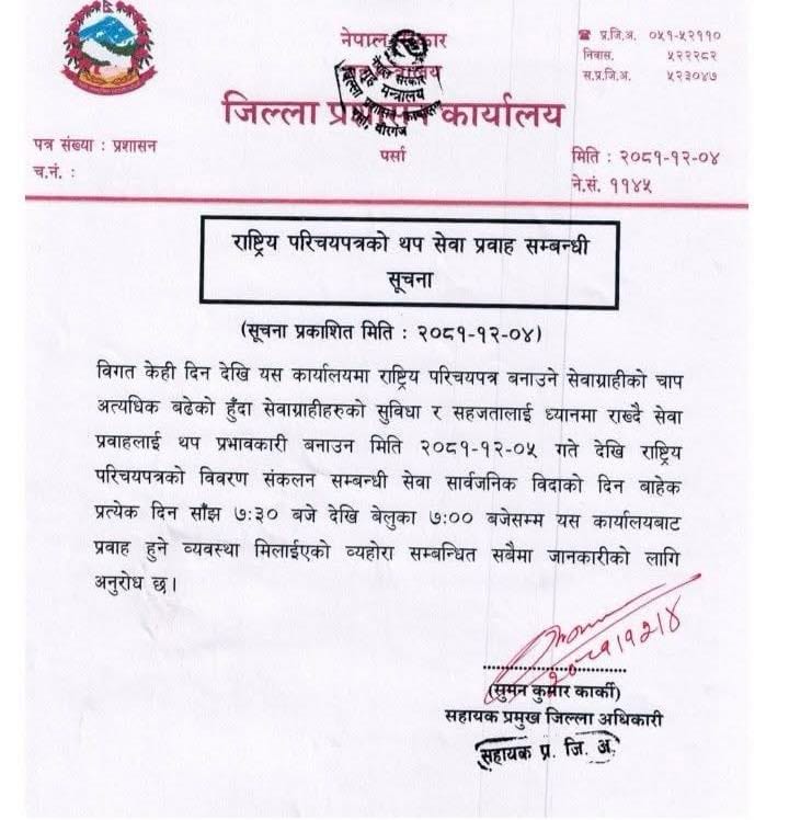राष्ट्रिय परिचयपत्र विवरण संकलन सम्बन्धीको सेवा प्रवाहमा पर्सा सिडिओको लचकता, भोली विहानै साढे ७ देखि बेलुका ७ बजेसम्म सेवा दिइने