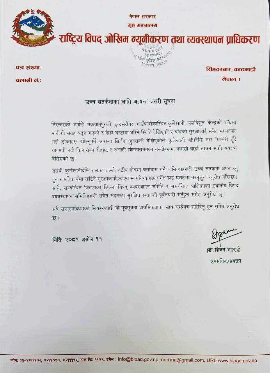 कुलेखानीको बाँधदेखि मधेशका रौतहट तथा सर्लाहीमा बाढी आउन सक्ने