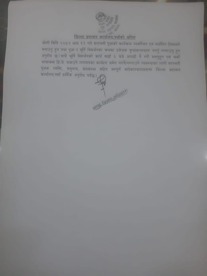 सरस्वती पूजाको बहानामा कुनै उत्तेजक क्रियाकलाप नगर्न पर्साका सिडियो अर्यालको आग्रह