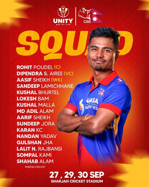 वेस्ट इन्डिजसँगको टी–२० सिरिजका लागि नेपाली टोली घोषणा, आदिल र सन्दीप टिममा फर्के