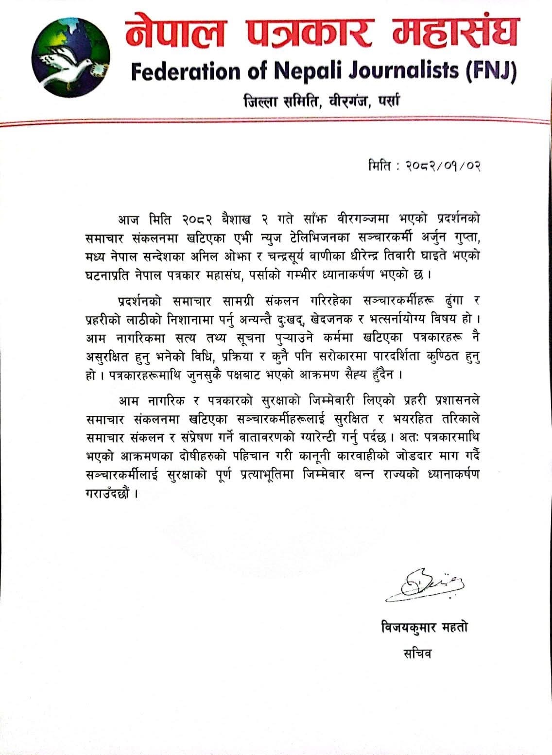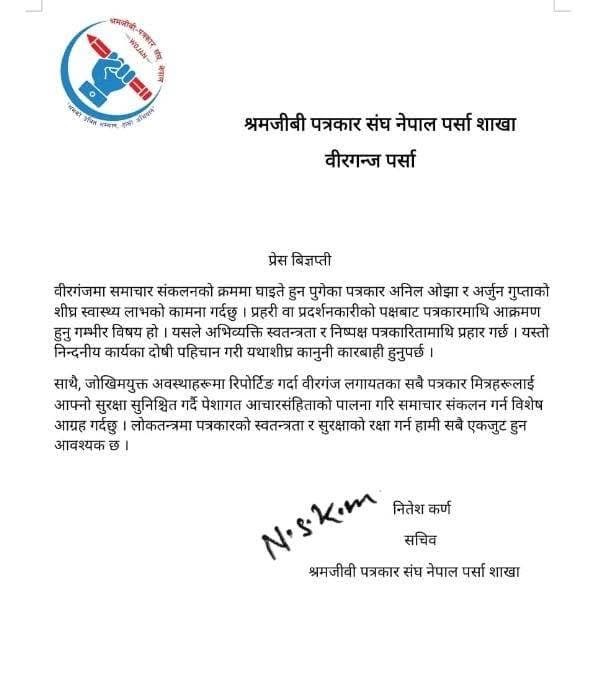 नेपाल पत्रकार महासंघ पर्सा, प्रेस सेन्टर नेपाल पर्सा, प्रेस चौतारी नेपाल पर्सा र श्रमजीवी पत्रकार संघ पर्साले छुट्टाछुट्टै प्रेस बिज्ञप्ती जारी गर्दै यस्तो माग गरेको हो ।