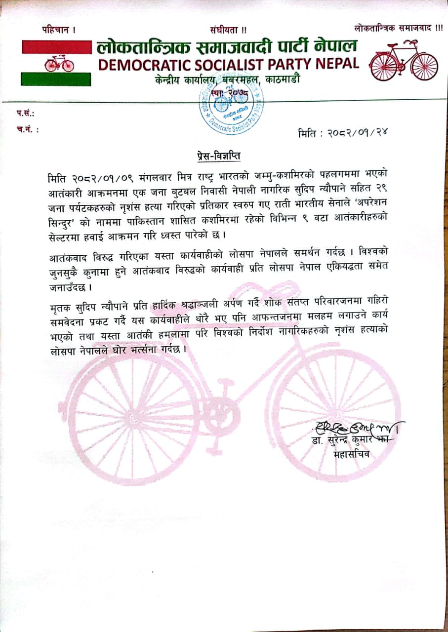 वीरगन्ज । भारतीय सेनाले ‘अपरेशन सिन्दुर’ नाम दिएर पाकिस्तान शासित काश्मिरमा गरेको हवाई आक्रमणलाई लोकतान्त्रिक समाजवादी पार्टी (लोसपा) नेपाल र नेपाल–भारत खुला सीमा संवाद समूहले समर्थन गरेका छन् ।