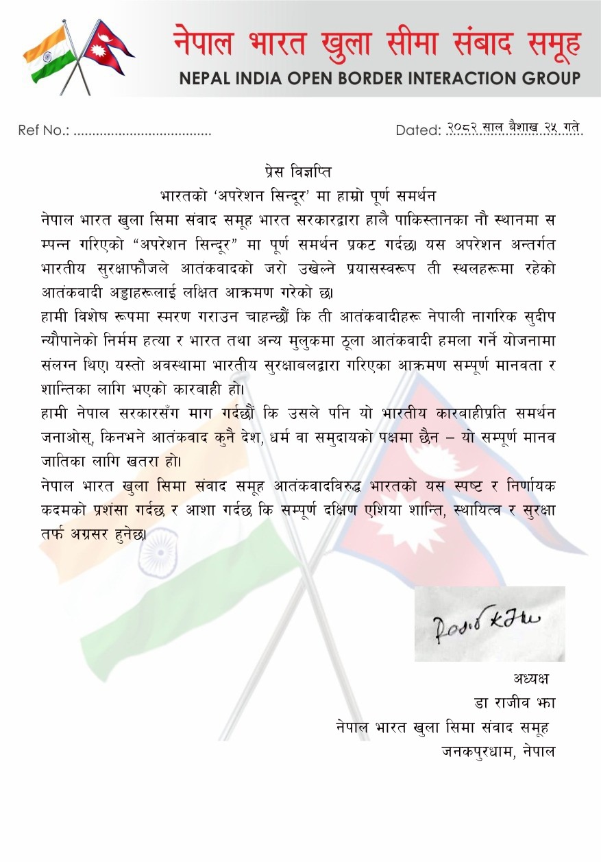 यसैगरी नेपाल भारत खुला सीमा संवाद समूहले भारत सरकारद्वारा हालै पाकिस्तानका नौ स्थानमा सम्पन्न गरिएको ‘अपरेशन सिन्दूर’ नामक हवाई आक्रमणलाई पूर्ण समर्थन प्रकट गरेको छ ।