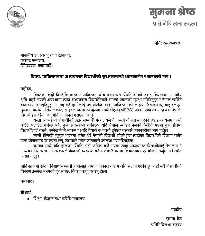 परराष्ट्रमन्त्री डा आरजु राणा देउवालाई पत्र लेख्दै उनले पाकिस्तानमा अध्ययनरत विद्यार्थीको सुरक्षाबारे ध्यानाकर्षण गराएकी हुन् । विगतका केही दिनदेखि भारत र पाकिस्तानबिच तनावग्रस्त स्थिति बनेको छ । पाकिस्तानको लाहोर, फैसलाबाद, बाहावलपुर, मुल्तान, कराँची, सियालकोट, सहिवल जस्ता ठाउँहरूमा एमबीबीएस पढ्न गएका ८० भन्दा बढी नेपाली विद्यार्थीहरू रहेका छन् ।