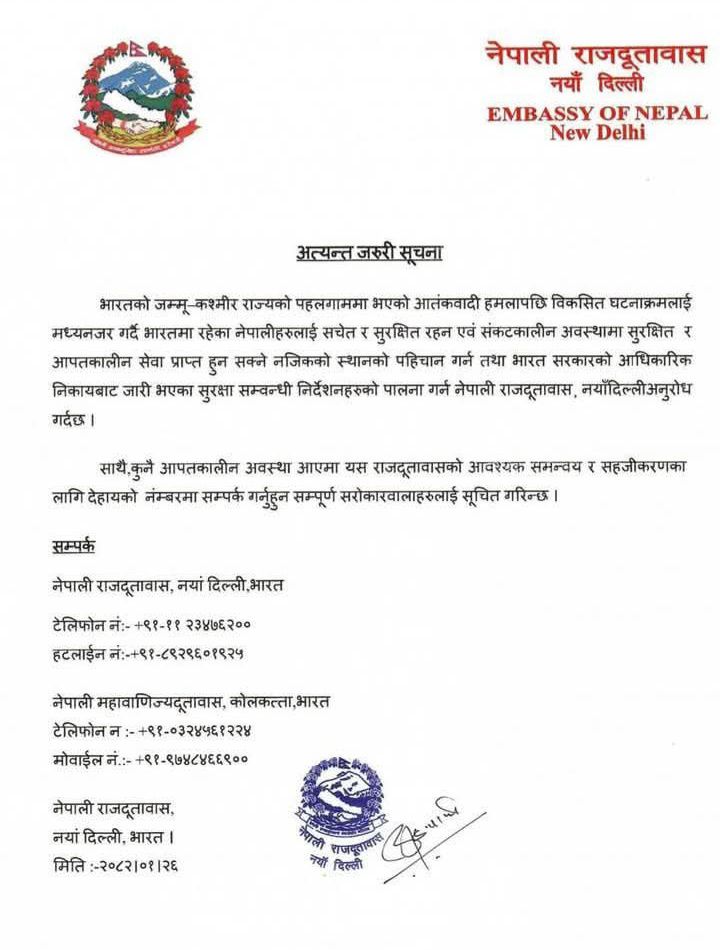 भारतको जम्मू–कश्मीर राज्यको पहलगाममा भएको आतंकवादी हमलापछि विकसित घटनाक्रमलाई मध्यनजर गर्दै भारतमा रहेका नेपालीहरुलाई सचेत र सुरक्षित रहन राजदूतावासले अनुरोध गरेको छ । संकटकालीन अवस्थामा सुरक्षित र आपतकालीन सेवा प्राप्त हुन सक्ने नजिकको स्थानको पहिचान गर्न तथा भारत सरकारको आधिकारिक निकायबाट जारी भएका सुरक्षा सम्बन्धी निर्देशनहरुको पालना गर्न नेपाली राजदूतावास, नयाँदिल्लीले शुक्रबार जारी गरेको सूचनामार्फत अनुरोध गरेको छ ।