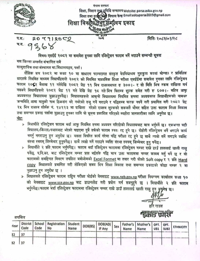 शिक्षा विकास तथा समन्वय इकाई, पर्साले एक सूचना प्रकाशन गर्दै पर्सा जिल्लाभित्रका सम्पूर्ण विद्यालयहरूलाई रजिस्ट्रेसन फारम भराउने कार्यलाई छिटो सम्पन्न गर्न आग्रह गरेको छ। यस कार्यको लागि मिति २०८२ साल वैशाख १२ गते देखि जेठ ११ गतेसम्म ३०० रुपैयाँ दस्तुर र जेठ १२ गतेदेखि जेठ १८ गतेभित्र डब्बल दस्तुर तिरेर फारम अनिवार्यरूपमा पेश गर्नुपर्ने जनाइएको छ।