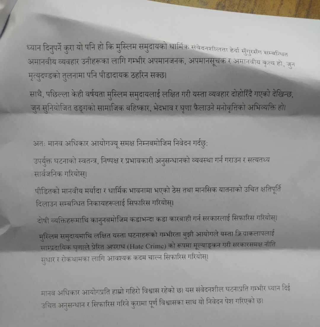 घटनाबारे आइतबार बसेको प्रतिनिधि सभाको बैठकमा जनमत पार्टीका सांसद अब्दुल खानले दोषीमाथि कडा कारबाहीको माग गरेका थिए । यता, मुस्लिम समुदायका अगुवाहरुले घटनाप्रति आयोगको ध्यानाकर्षण गराउँदै उजुरी दिएपछि आयोगले अनुसन्धान गर्ने भएको हो ।