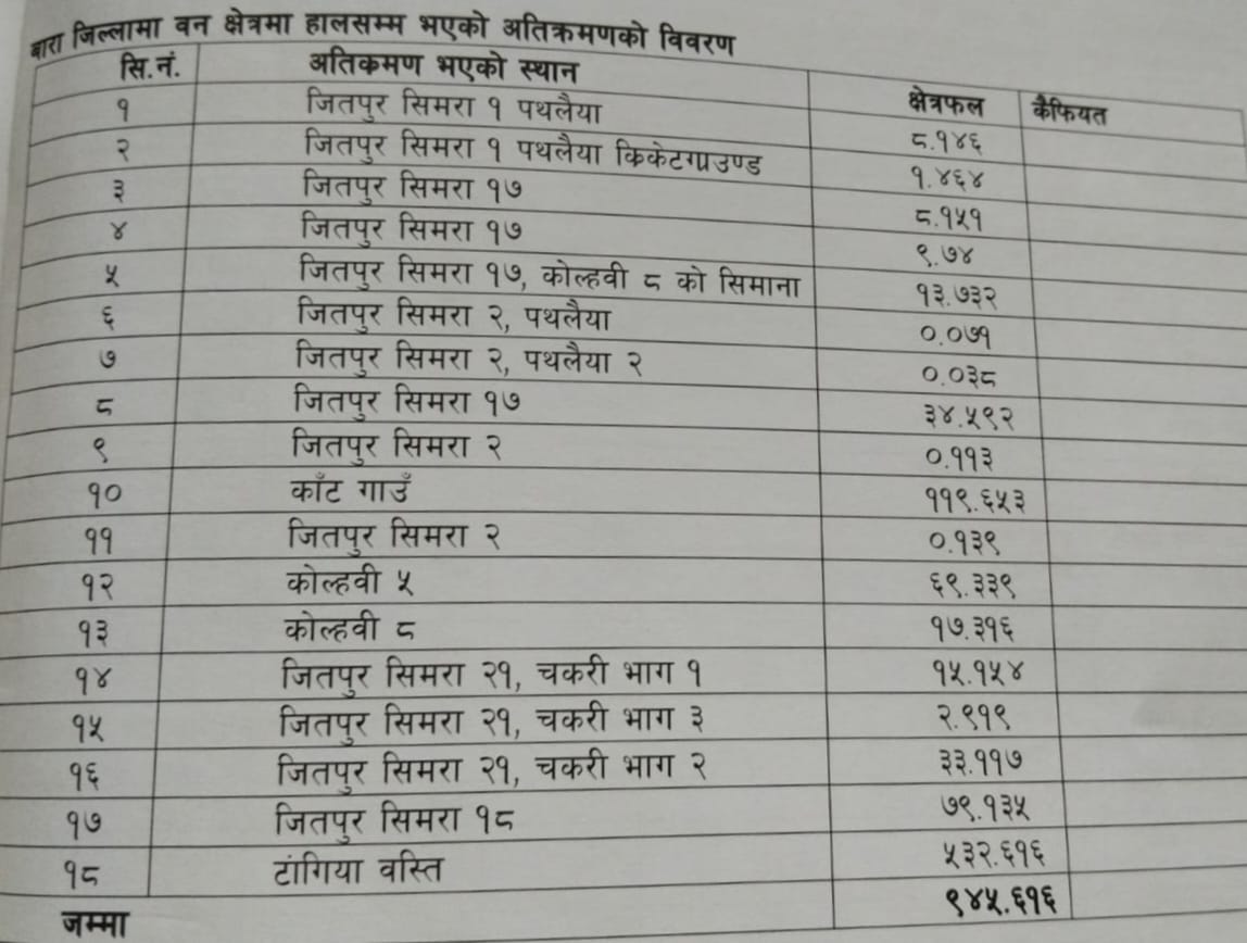 वीरगन्ज । पछिल्लो समय बारा जिल्लामा व्यापक वन अतिक्रमण भइरहेको तथ्य फेला परेको छ ।