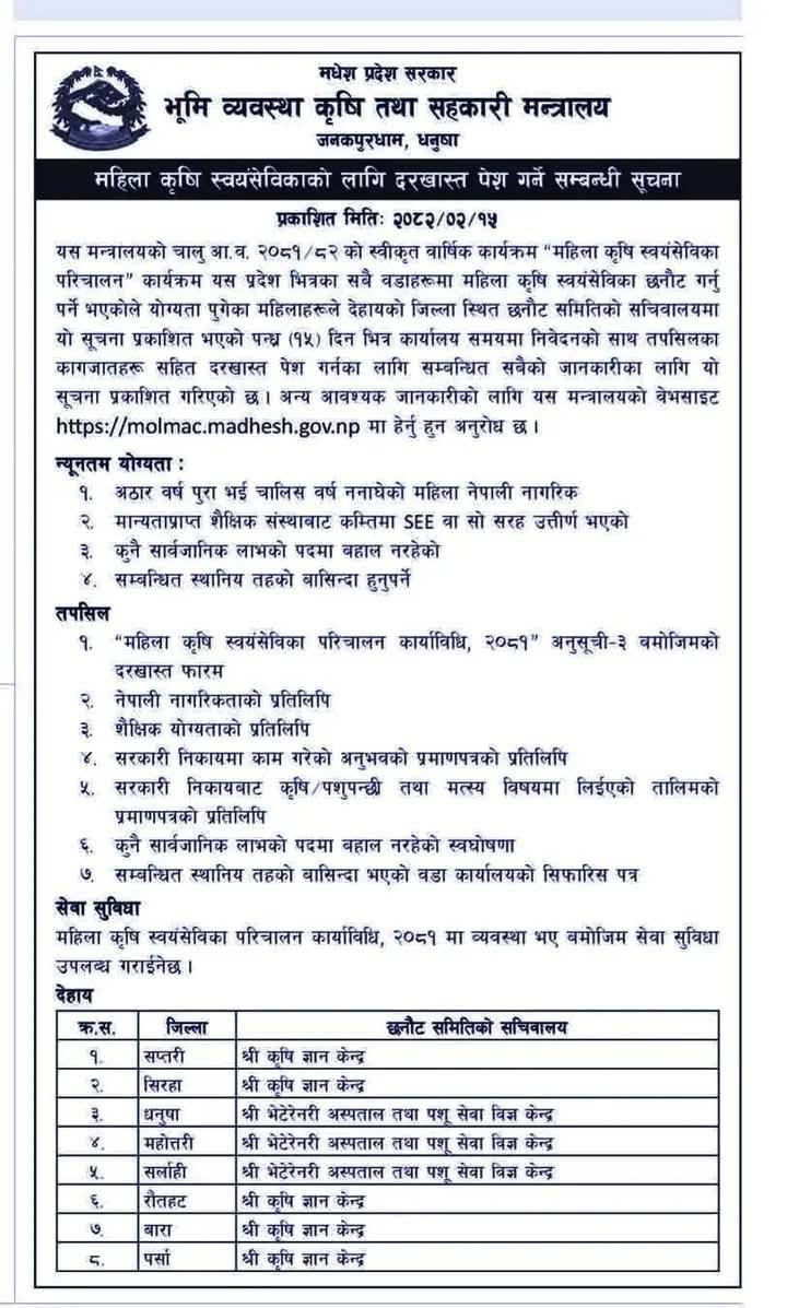 भूमि व्यवस्था, कृषि तथा सहकारी मन्त्रालयले ‘महिला कृषि स्वयंसेविका परिचालन कार्यक्रम’ अन्तर्गत १,४०० जना महिला कृषि स्वयंसेविका परिचालन गर्नका लागि दरखास्त आह्वान गरेको छ ।