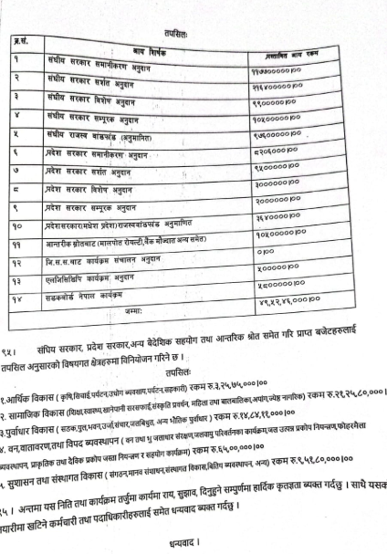 संकलित यस बजेटलाई नगरपालिकाले मुख्य पाँच विषयगत क्षेत्रहरूमा विनियोजन गर्नेछ। आर्थिक विकास, जसमा कृषि, सिँचाइ, पर्यटन, उद्योग व्यवसाय र सहकारी पर्छन्, त्यसका लागि ३ करोड २५ लाख ७५ हजार १०० रुपैयाँ छुट्याइएको छ। मानव विकास र सामाजिक न्यायमा जोड दिँदै शिक्षा, स्वास्थ्य, खानेपानी, सरसफाइ, संस्कृति प्रवर्धन, महिला तथा बालबालिका, अपांग र ज्येष्ठ नागरिकका लागि २१ करोड २५ लाख ८० हजार रुपैयाँ विनियोजन गरिएको छ, जुन यो वर्षको सबैभन्दा ठूलो विनियोजन हो।