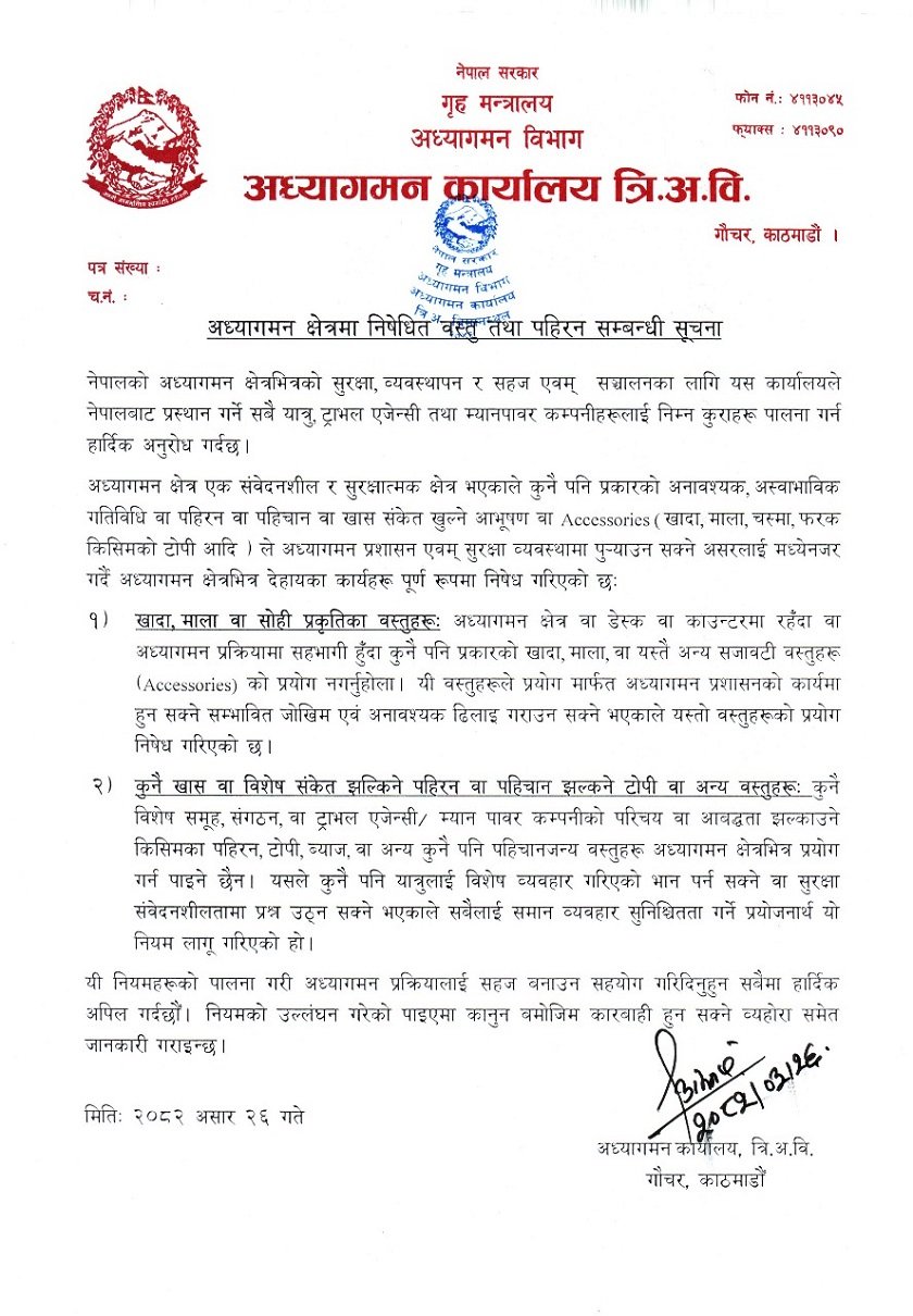 अध्यागमन कार्यालयले एक सूचना जारी गर्दै भनेको छ कि अध्यागमन क्षेत्र अत्यन्त संवेदनशील र सुरक्षात्मक हुने भएकाले यस्ता वस्तुहरूको प्रयोगले सुरक्षा जोखिम बढाउनुका साथै अनावश्यक ढिलाइ गराउन सक्छ। यो नियम सम्पूर्ण यात्रु, ट्राभल एजेन्सी र म्यानपावर कम्पनीहरूलाई लागू हुनेछ।