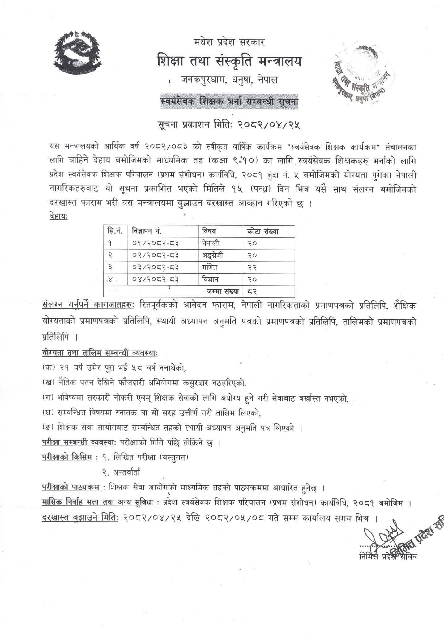 जनकपुरधाम । मधेश प्रदेश सरकारको शिक्षा तथा संस्कृति मन्त्रालयले माध्यमिक तह (कक्षा ९–१०) का लागि ८२ जना स्वयंसेवक शिक्षक भर्नाका लागि आवेदन आह्वान गरेको छ।