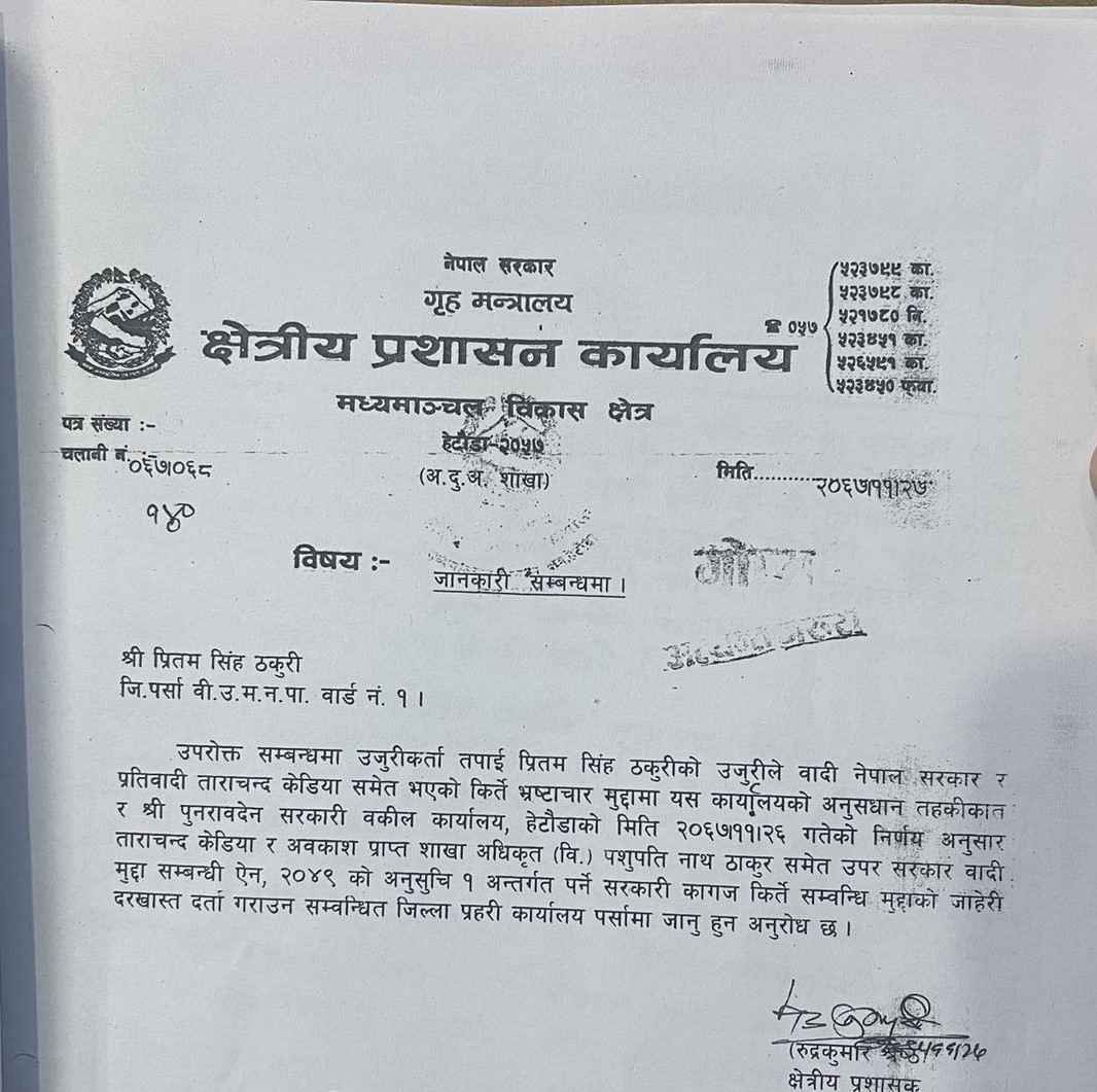 अर्थात् यो निवेदनबाट तत्कालीन क्षेत्रीय प्रशासन कार्यालयमा सूक्ष्म अनुसनधान गरेर किर्ते गरेको ठहर गर्दै ०६७ सालको फागुन २० गते ताराचन्द्र केडिया र मालपोत कार्यालयका तत्कालीन अवकास प्राप्त शाखा अधिकृत पशुपतिनाथ ठाकुरसमेतको विरोधमा निर्णय ग¥यो, जसमा क्षेत्रीय प्रशासन कार्यालयले जालसाजी गरेको मालपोत तथा केडियामाथि सरकारी कागजात किर्ते सम्बन्धीको मुद्दा चलाएर अनुसन्धान प्रक्रिया अगाडि बढाउन निर्देशन दियो ।