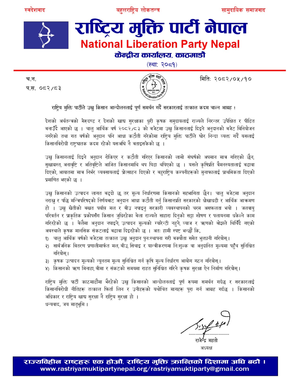 पार्टीले चालु आर्थिक वर्षको बजेटमा उखु अनुदानको बजेट विनियोजन नगरेको र गत वर्षको अनुदान आधा कटौती गरेकोमा सरकारको कडा आलोचना गरेको छ। पार्टीले यस कदमलाई किसानविरोधी र राष्ट्रघातकको संज्ञा दिएको छ।