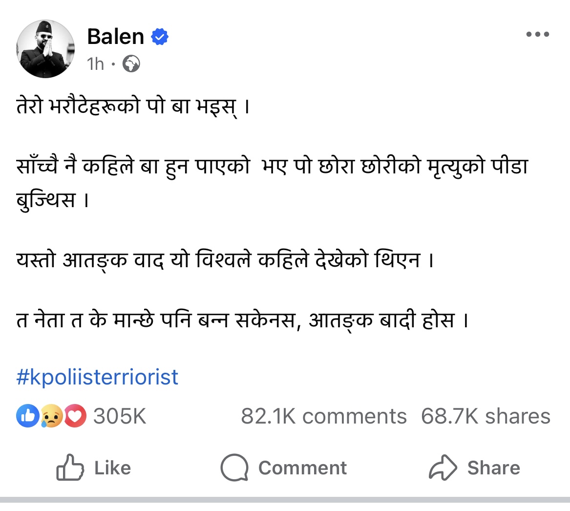 मेयर साहले आफ्नो फेसबुक स्टाटसको ह्यासट्यागमा #kpoliisterrorist प्रयोग गरेका छन् । बालेनले आइतबारदेखि नै जेन–जीको आन्दोलनलाई समर्थन गर्ने जनाएका थिए ।