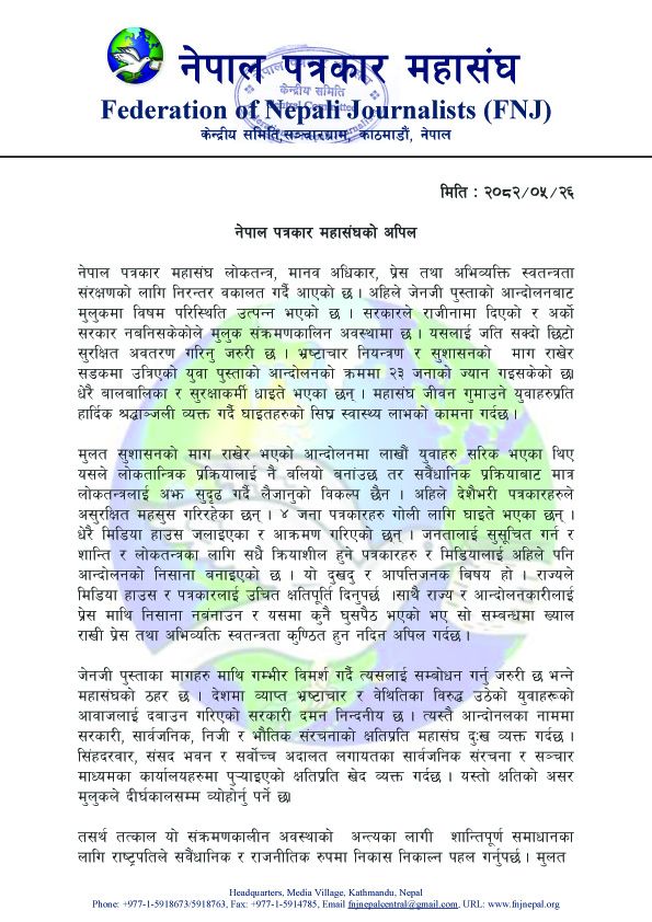 महासंघले राज्य र आन्दोलनकारी दुवै पक्षलाई प्रेसमाथि निशाना नबनाउन आग्रह गरेको छ। पत्रकार र मिडियालाई जनतालाई सुसूचित गर्ने आफ्नो कर्तव्य निर्वाह गर्न दिन र प्रेस तथा अभिव्यक्ति स्वतन्त्रता कुण्ठित हुन नदिन महासंघले अपिल गरेको छ।