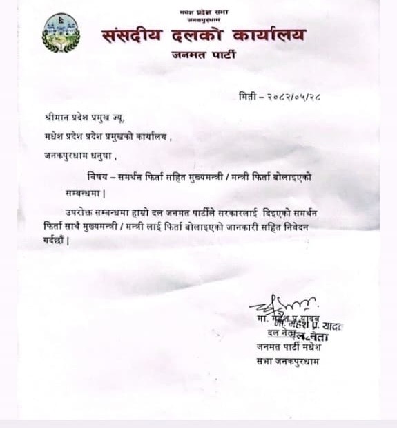 जनमत पार्टी संसदीय दलका नेता महेशप्रसाद यादवले आज मधेश प्रदेश प्रमुखलाई पत्र पठाउँदै समर्थन फिर्ता लिएको जानकारी गराएका हुन्।