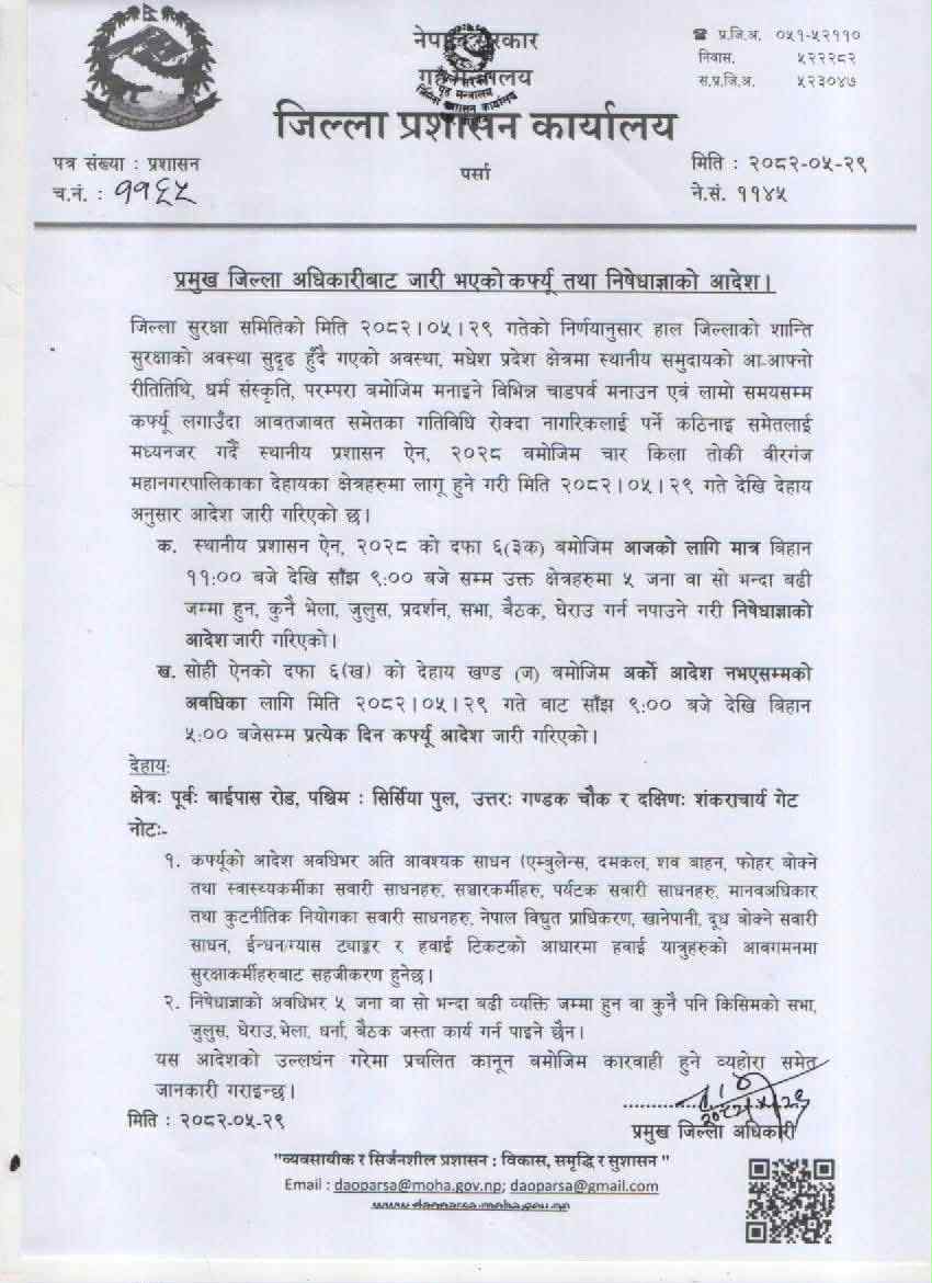 वीरगन्ज । जिल्लाको शान्ति सुरक्षा कायम गर्न पर्सा जिल्ला प्रशासन कार्यालयले वीरगन्जका केही तोकिएका क्षेत्रमा कर्फ्यू र निषेधाज्ञाको आदेश जारी गरेको छ।
