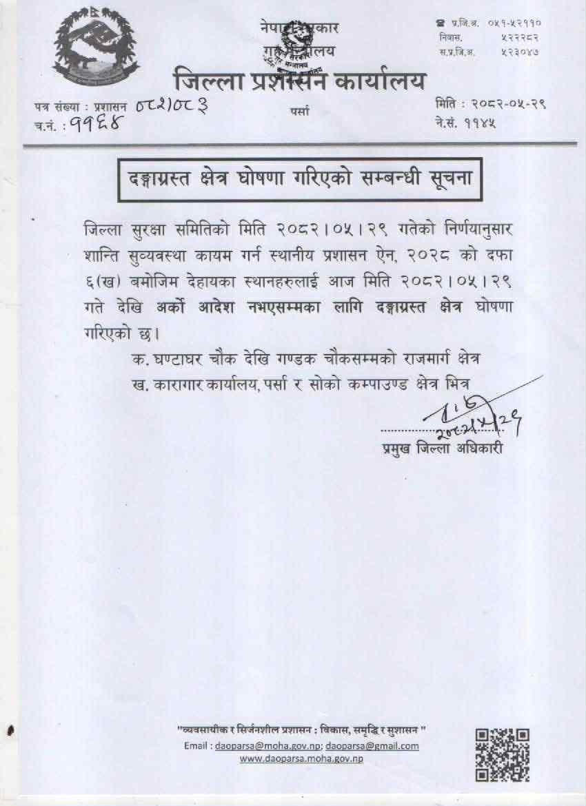 यसैगरी, शान्ति सुव्यवस्था कायम गर्न जिल्ला सुरक्षा समितिले ‘स्थानीय प्रशासन ऐन, २०२८’ बमोजिम देहायका दुई स्थानलाई दङ्गाग्रस्त क्षेत्र घोषणा गरेको छ । घण्टाघर चोकदेखि गण्डक चोकसम्मको राजमार्ग क्षेत्र र कारागार कार्यालय, पर्सा र त्यसको कम्पाउन्डभित्रको क्षेत्रमा प्रशासनले यी आदेशहरूको उल्लङ्घन गर्नेलाई प्रचलित कानूनअनुसार कारबाही गरिने समेत चेतावनी दिएको छ।