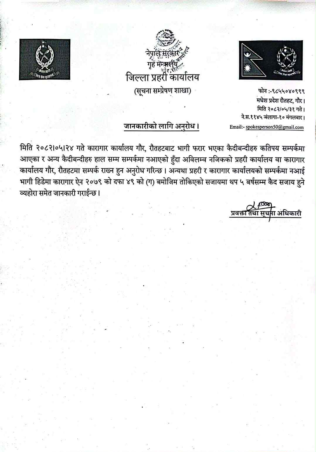 जिल्ला प्रहरी कार्यालय, रौतहटका प्रवक्ताले एक विज्ञप्ति जारी गर्दै फरार सबै कैदीबन्दीलाई अविलम्ब नजिकको प्रहरी कार्यालय वा कारागार कार्यालय गौरमा सम्पर्क राख्न अनुरोध गरेका छन्। यदि उनीहरू सम्पर्कमा नआई भागी हिँडेमा कारागार ऐन २०७९ को दफा ४९ (ग) अनुसार तोकिएको सजायमा थप ५ वर्षसम्म कैद सजाय हुने चेतावनी पनि दिइएको छ।