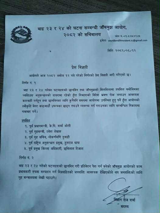 आयोगले उनीहरूलाई विदेश भ्रमणमा जान नदिन र छानबिन नसकिएसम्म काठमाडौं उपत्यका बाहिर जान पनि स्वीकृति लिनुपर्ने व्यवस्था गर्न सरकारलाई भनेको छ।