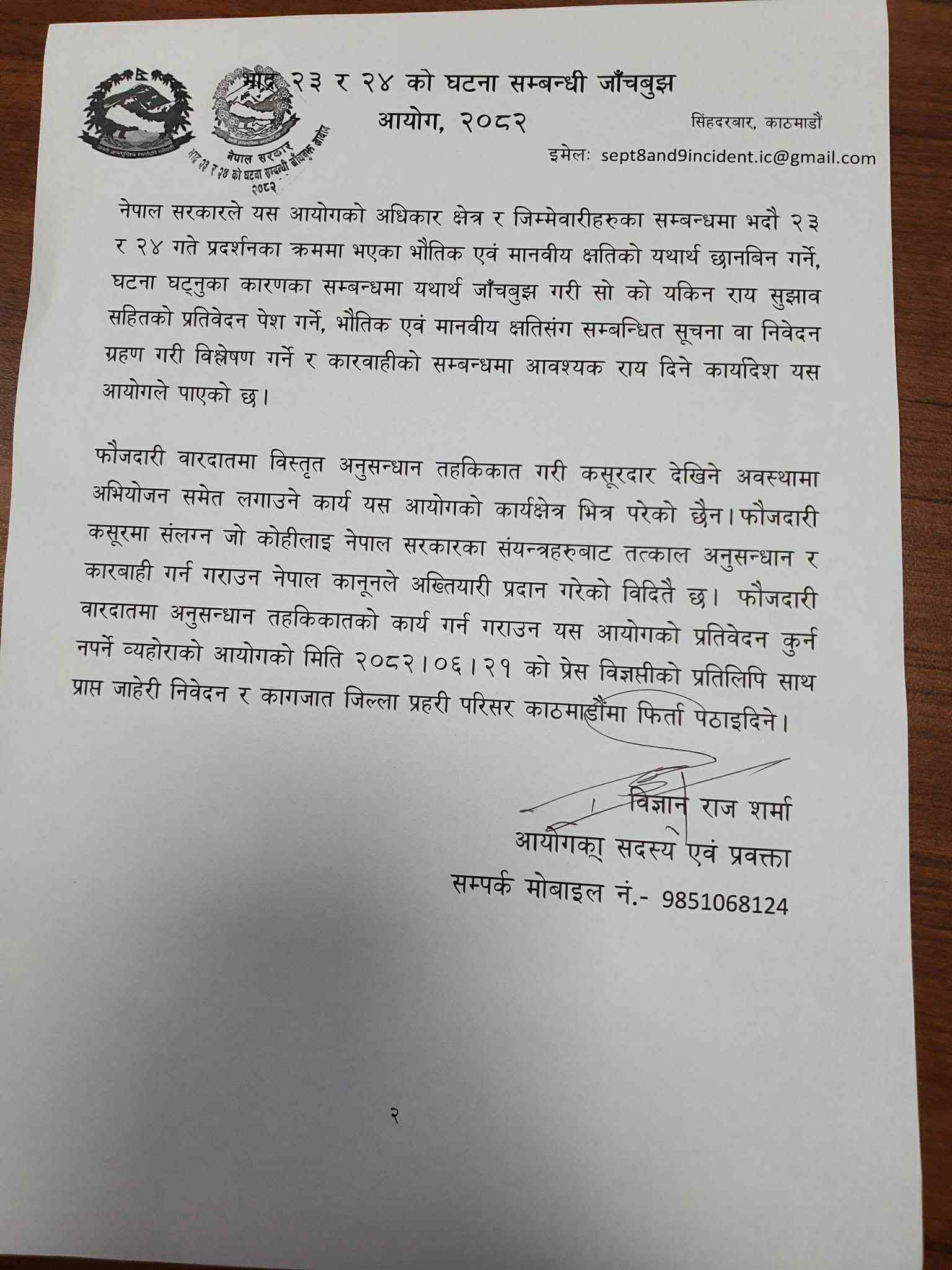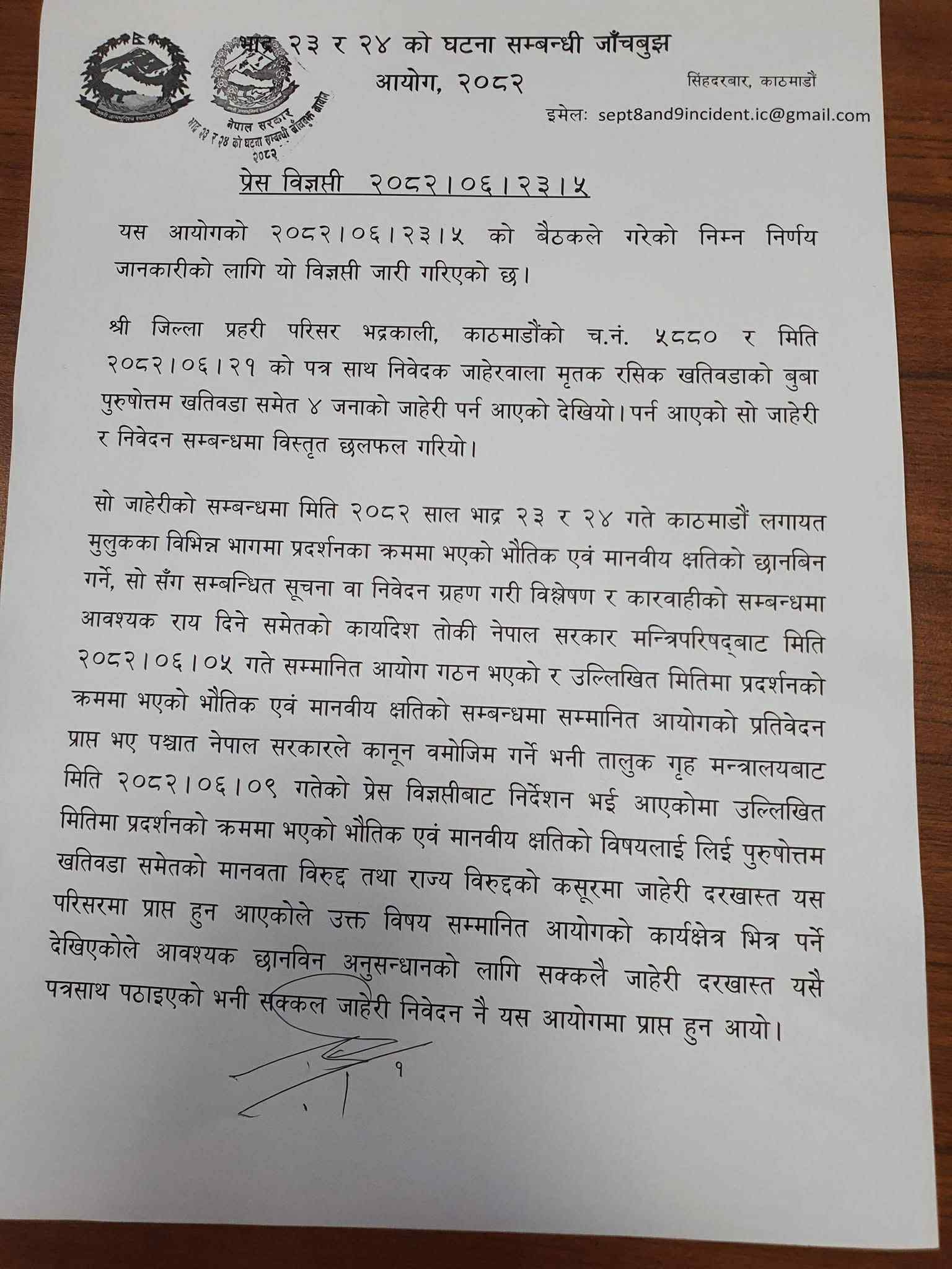वीरगन्ज । भाद्र २३ र २४ गतेको जेनजी प्रदर्शनका क्रममा भएको मानवीय तथा भौतिक क्षतिबारे छानबिन गर्न गठित जाँचबुझ आयोगले प्राप्त भएको एउटा महत्त्वपूर्ण जाहेरी दरखास्त जिल्ला प्रहरी परिसर काठमाडौंमा फिर्ता पठाएको छ।