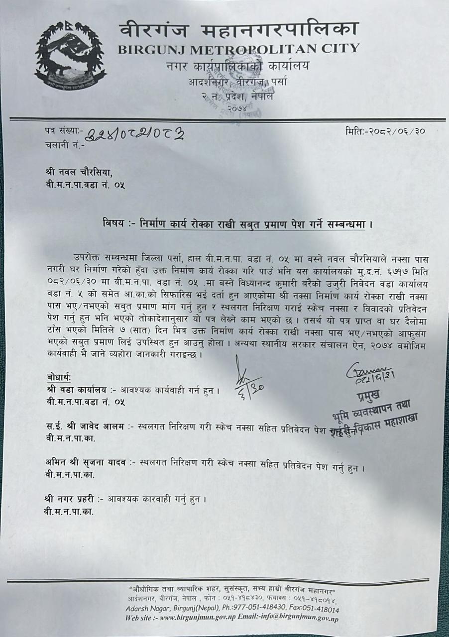 विवाद बढेपछि वीरगन्ज महानगरपालिका नगर कार्यपालिकाको कार्यालयले असोज ३० गते पत्रमार्फत नवल चौरसियालाई ७ दिनभित्र निर्माण कार्य रोक्का गरी नक्सा पास भए–नभएको सबुत प्रमाणसहित कार्यालयमा उपस्थित हुन कडा आदेश दिएको छ। यदि आदेश पालना नगरिए स्थानीय सरकार सञ्चालन ऐन, २०७४ बमोजिम कारबाही हुने चेतावनी पनि महानगरले दिएको छ।