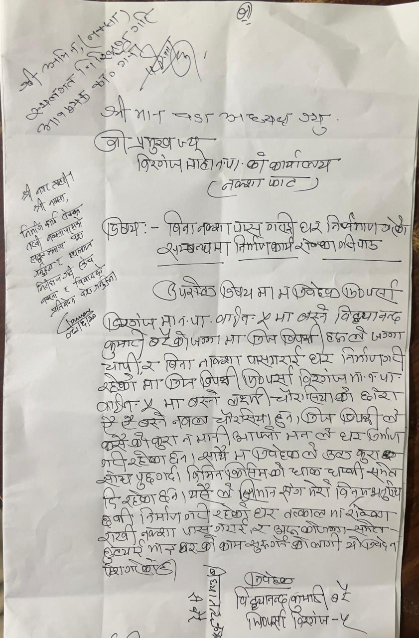 बरैले महानगरमा दिएको निवेदनमा नवल चौरसियाले कसैको कुरा नसुनी मनपरी ढंगले निर्माण कार्यलाई निरन्तरता दिएको र सोधपुछ गर्दा धाकधम्की समेत दिने गरेको उल्लेख छ।