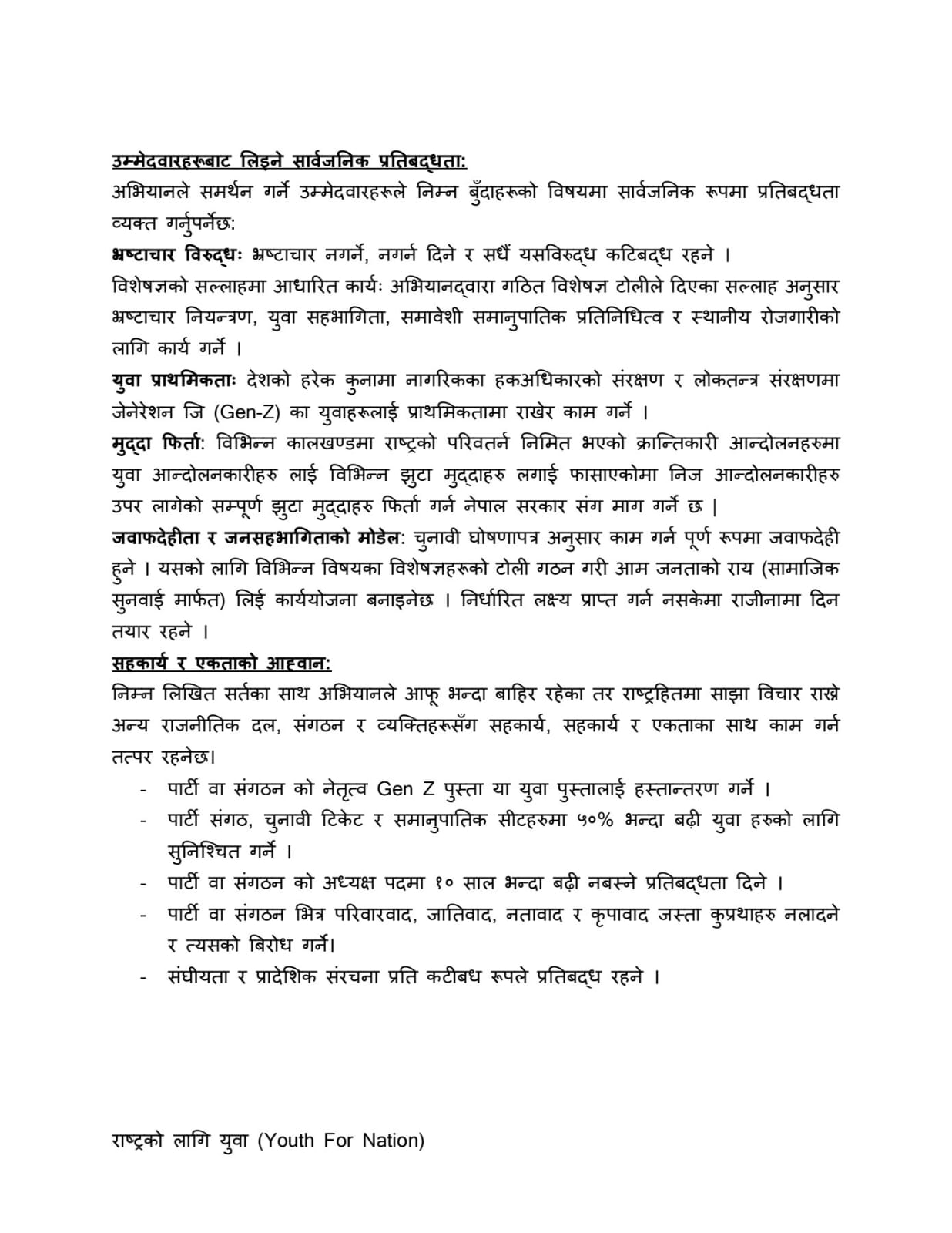 यो अभियानले अन्य राजनीतिक दलहरूसँग सहकार्य गर्न सकिने तर त्यसका लागि पार्टी नेतृत्व युवा पुस्तालाई हस्तान्तरण गर्नुपर्ने, चुनावी टिकटमा ५० प्रतिशतभन्दा बढी युवाको सुनिश्चितता गर्नुपर्ने, अध्यक्ष पदमा १० वर्षभन्दा बढी नबस्ने र परिवारवाद, जातिवाद तथा कृपावाद जस्ता कुप्रथाहरू त्याग्नुपर्ने जस्ता शर्तहरू अघि सारेको छ।