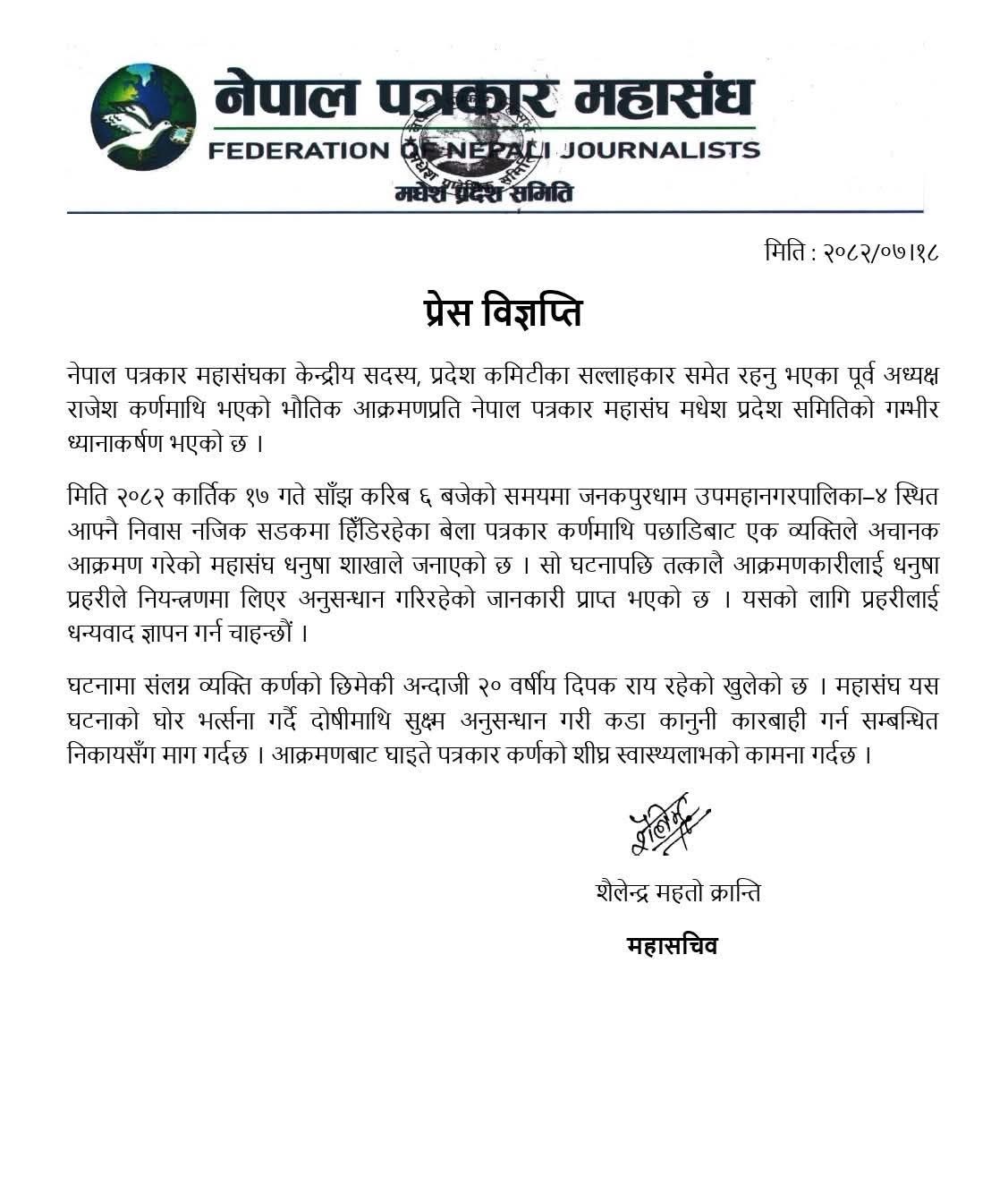 त्यसैगरी, आक्रमणबाट घाइते पत्रकार कर्णको शीघ्र स्वास्थ्यलाभको शुभकामना पनि महासंघले व्यक्त गरेको छ।