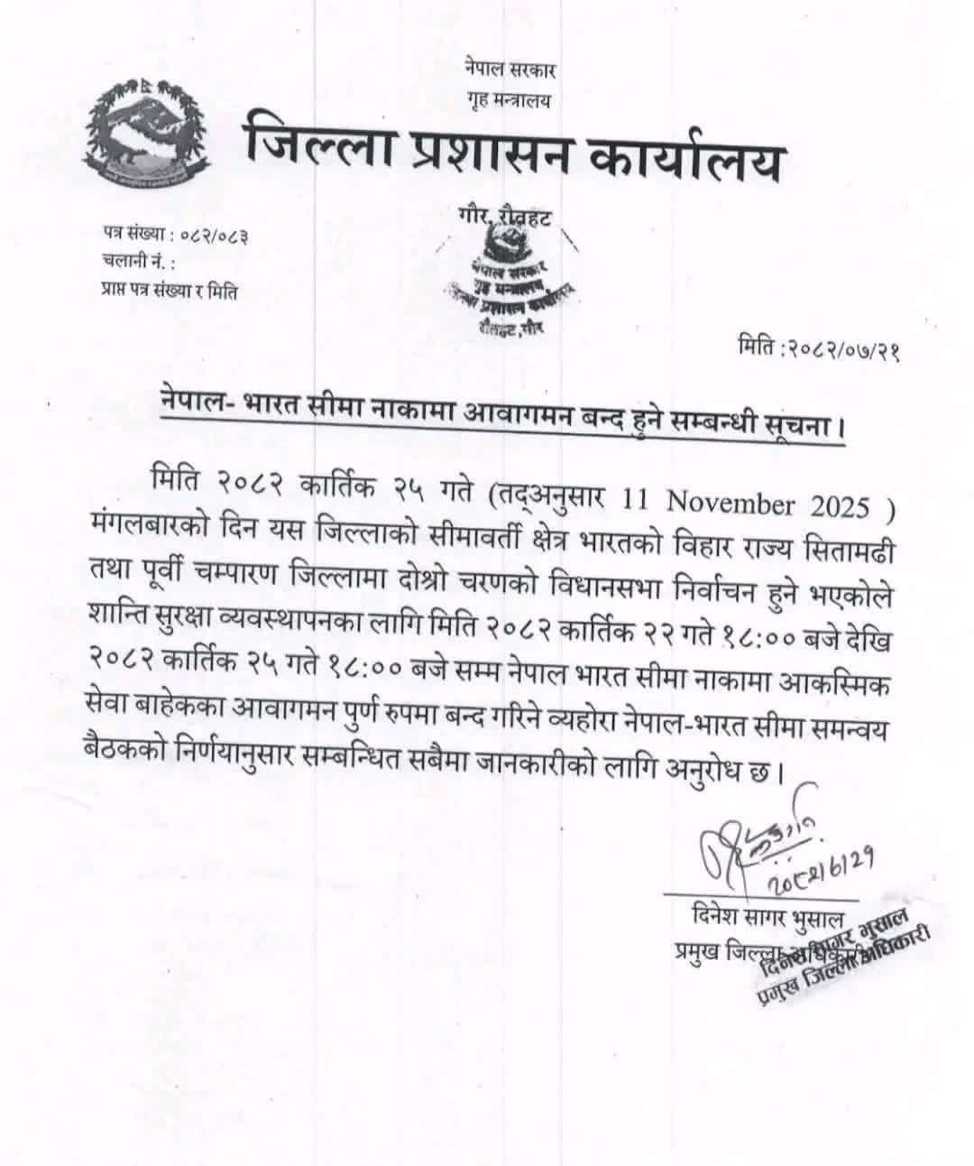 मधेस प्रदेशका धनुषा, महोत्तरी, रौतहट, बारा, पर्सा, सर्लाही, सप्तरी, सिरहा, रसुवा र अन्य सम्बन्धित जिल्लाका प्रमुख जिल्ला अधिकारीहरूले जारी गरेको सूचनाअनुसार, भोली शनिबार (कार्तिक २२ गते) बिहान ६ बजेदेखि बुधबार (कार्तिक २५ गते) बेलुका ६ बजेसम्म सीमा नाका पूर्ण रूपमा बन्द रहनेछ।
