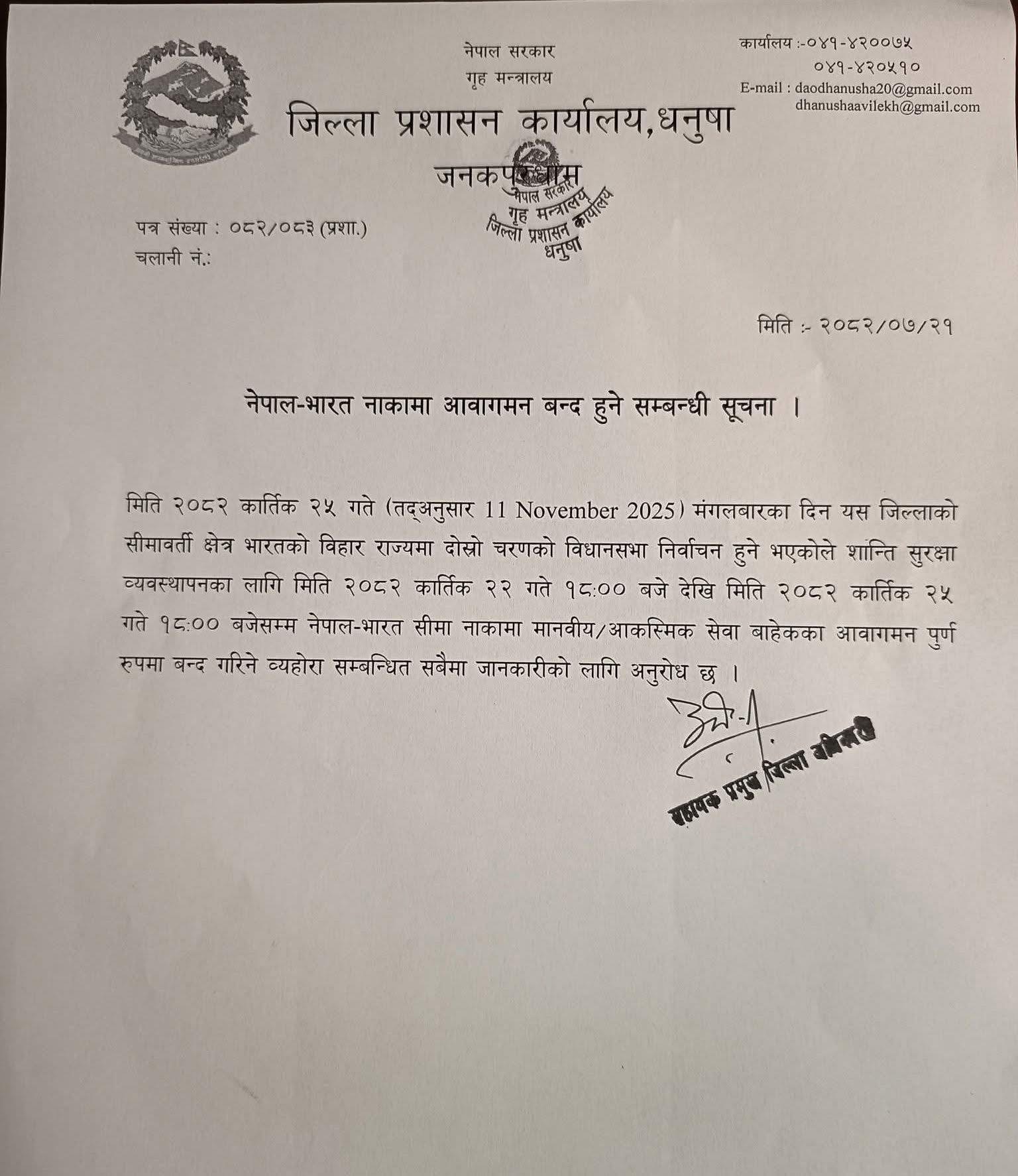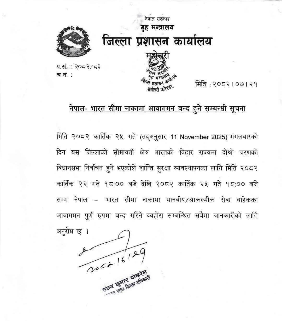धनुषा जिल्ला प्रशासन कार्यालयले जारी गरेको सूचनामा भनिएको छ, “भारतको बिहार राज्यमा दोस्रो चरणको विधानसभा निर्वाचन हुन लागेकोले शान्ति सुरक्षा कायम राख्न मधेस प्रदेशसँग जोडिएका सबै सीमाका नाकामा मानवीय तथा सवारी आवागमन पूर्ण रूपमा रोक्नुपर्ने भएकोले यो सूचना जारी गरिएको हो।”