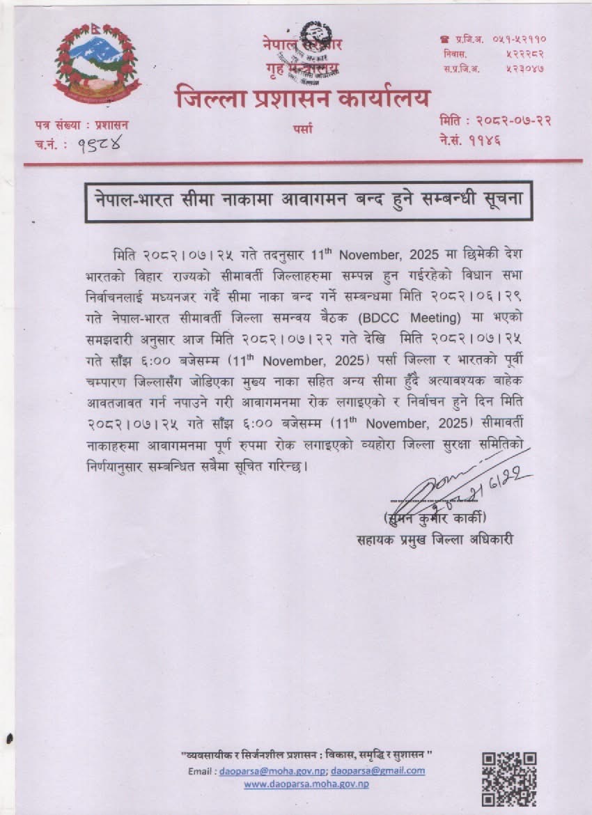 बिहार विधानसभा चुनावका कारण आजदेखि पर्साका नेपाल–भारत नाका बन्द