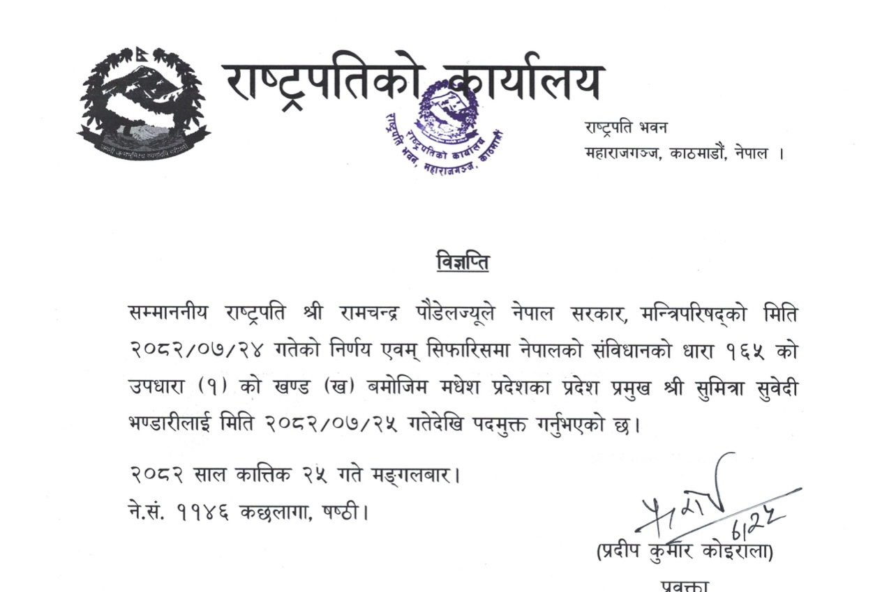 जनकपुर । मधेस प्रदेशका प्रदेश प्रमुख सुमित्रा सुवेदी भण्डारीलाई आज पदमुक्त गरिएको छ ।