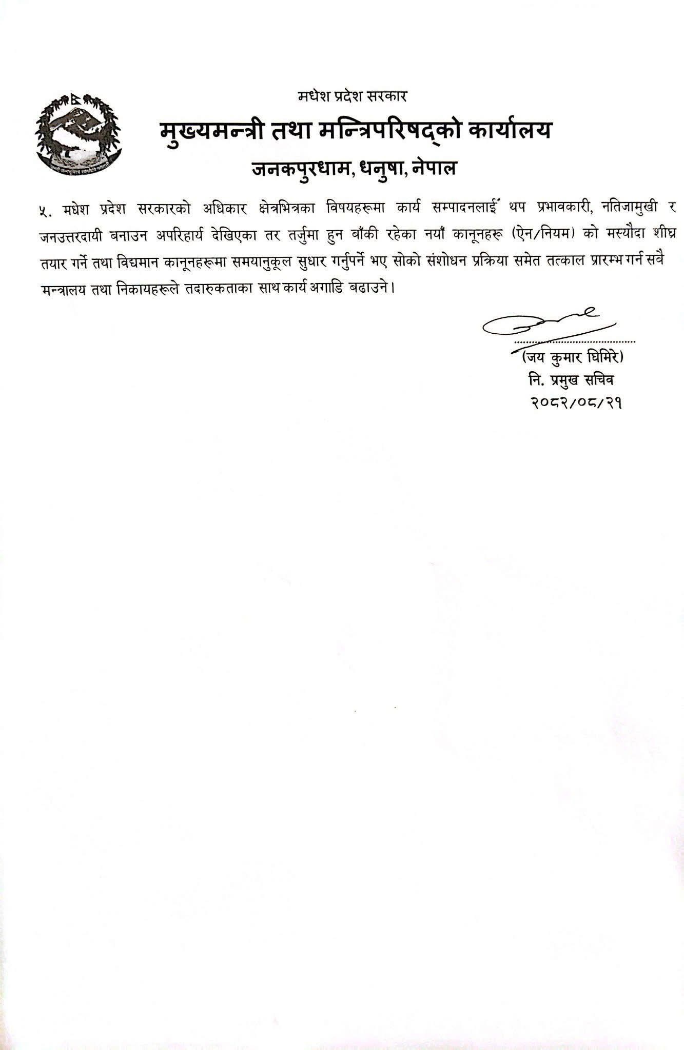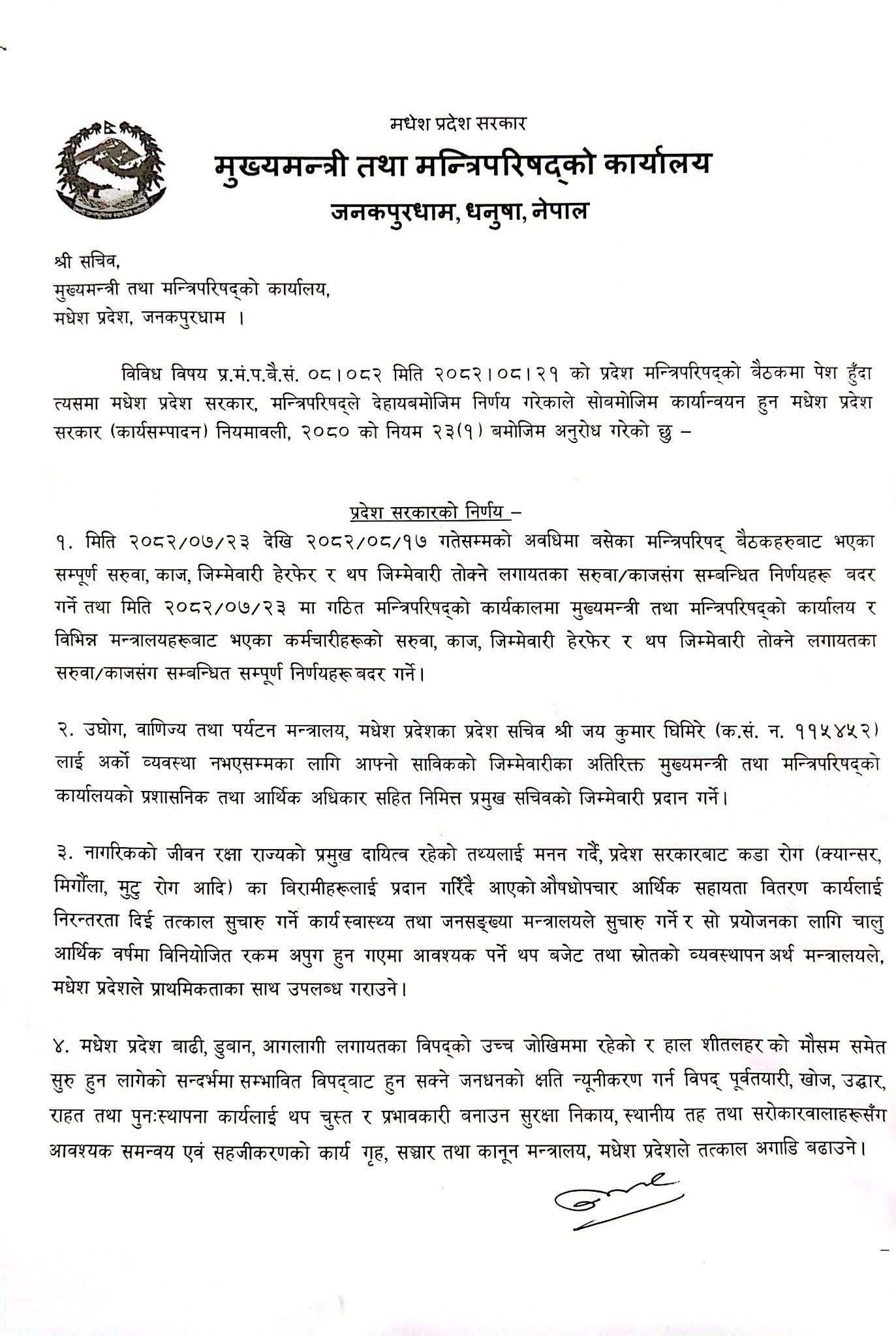 साथै, उद्योग, वाणिज्य तथा पर्यटन मन्त्रालयका प्रदेश सचिव जयकुमार घिमिरेलाई अर्को व्यवस्था नभएसम्म निमित्त प्रमुख सचिव को जिम्मेवारी दिने निर्णय गरिएको छ।