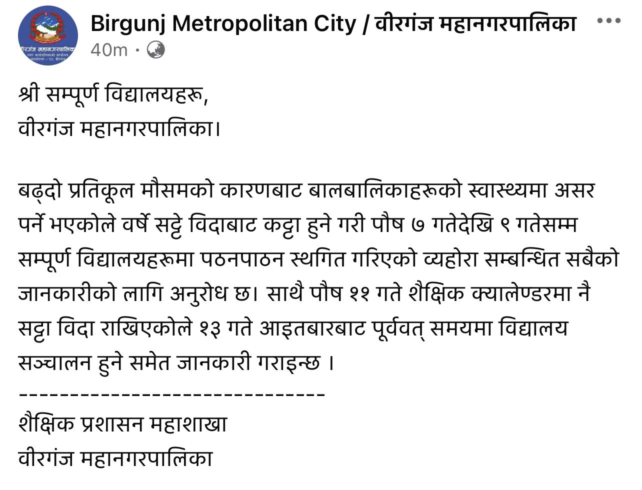 महानगरपालिकाका अनुसार वर्षे सट्टे बिदाबाट कट्टा हुने गरी पुस ७ गतेदेखि पुस ९ गतेसम्म वीरगन्ज महानगरभित्र सञ्चालित सबै सामुदायिक तथा संस्थागत विद्यालयहरू बन्द रहनेछन्।