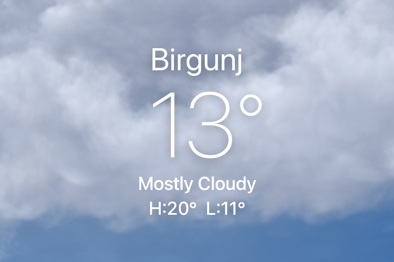 स्थानीय मौसम मापनअनुसार मंगलबार बिहान पौने १० बजेसम्म वीरगन्जको तापक्रम १३ डिग्री सेल्सियसमा झरेको छ, जुन गर्मीमा एसीले दिने अधिकतम चिसो १६ डिग्रीभन्दा पनि कम हो।